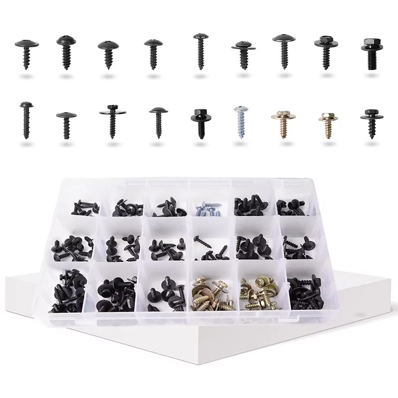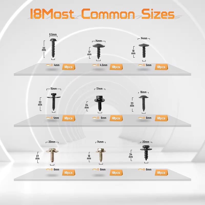 Clips de retenue de fixations automobiles d'accessoires automobiles de haute qualité du fournisseur Qeepei, un kit mixte de 180 pièces conçu pour répondre à divers besoins de fixation automobile. Cet ensemble polyvalent comprend des vis mixtes pour garde-boue de carrosserie de tailles 5 mm, 5,5 mm, 6 mm et 6,3 mm, ainsi que des vis autotaraudeuses en métal, des rivets et des boulons. Conçu pour la durabilité et la fiabilité, ce kit est essentiel pour les ateliers de réparation de véhicules, les centres de modification et les constructeurs automobiles. Chaque composant est fabriqué à partir de métal de haute qualité, garantissant des performances durables et une résistance à l'usure et à la corrosion.