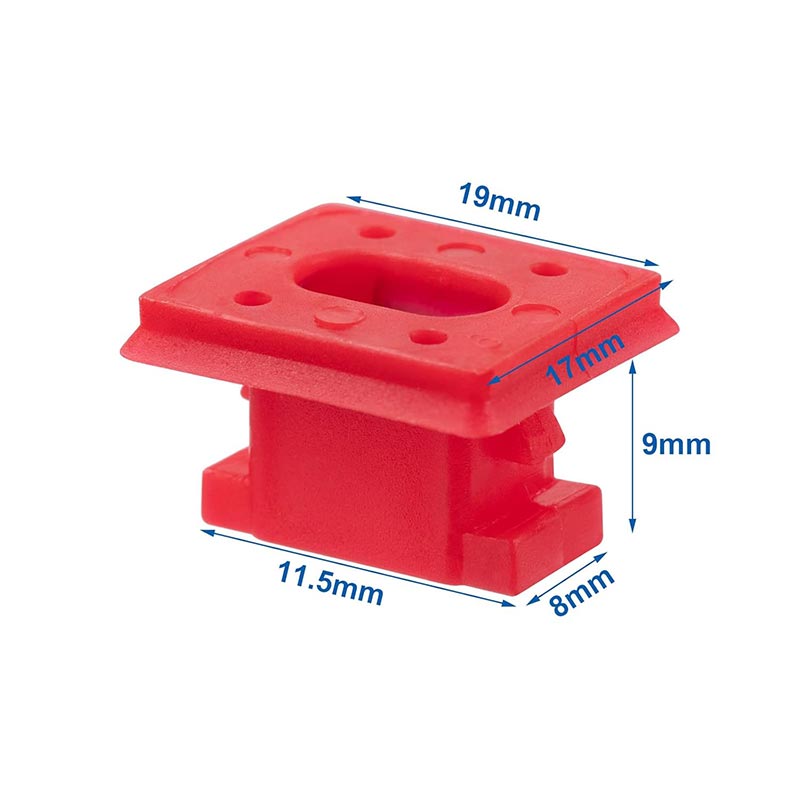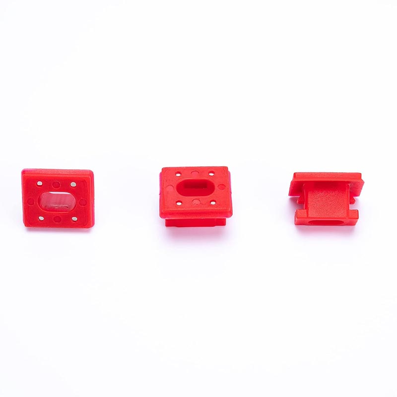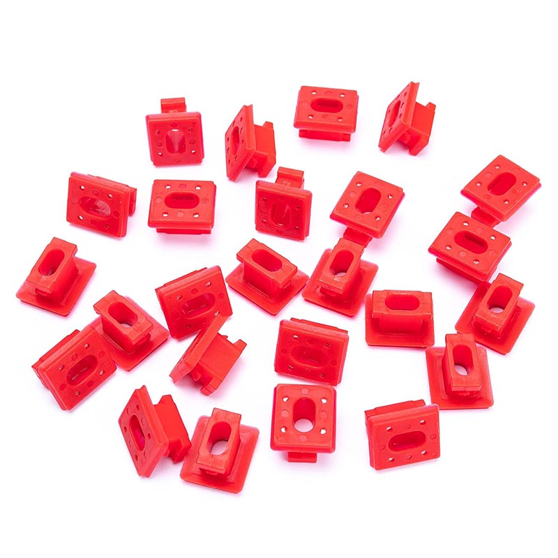 Cette image montre des pièces en plastique rouge, qui sont les œillets de garniture intérieure pour BMW. Ils ont des structures et des fonctions différentes. La partie la plus à gauche présente une ouverture rectangulaire entourée de huit trous de vis. La partie médiane est similaire à celle de gauche mais sans l'ouverture rectangulaire. La partie la plus à droite est conçue comme un couvercle qui peut être ouvert pour exposer une cavité interne. Ces pièces sont utilisées dans divers modèles BMW pour ajuster la position de la garniture intérieure et assurer un ajustement serré. Ils jouent également un rôle dans la réduction du bruit et la prévention de la poussière.