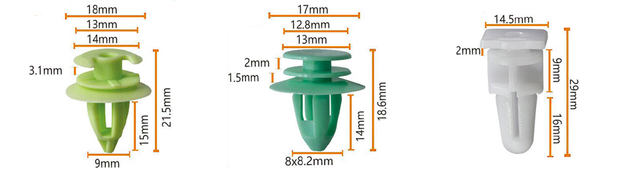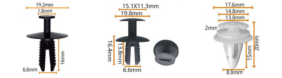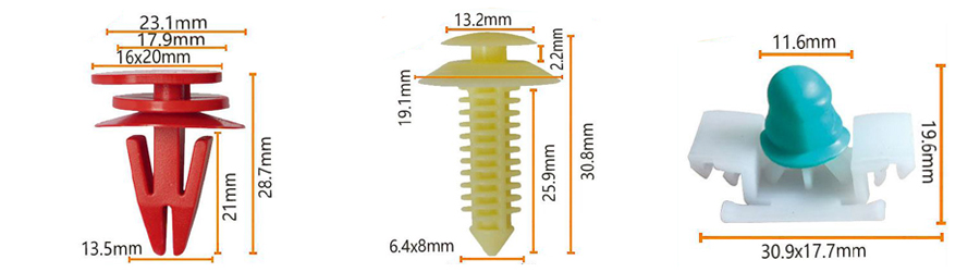 Clips de libération rapide en plastique: Utilisé pour fixer les panneaux de carrosserie, les pare-chocs, les doublures des arcs de roue, etc. Ces clips sont généralement en plastiques à haute température et à haute température et sont conçus avec une fonction à libération rapide, ce qui facilite la réparation ou le remplacement des pièces.
